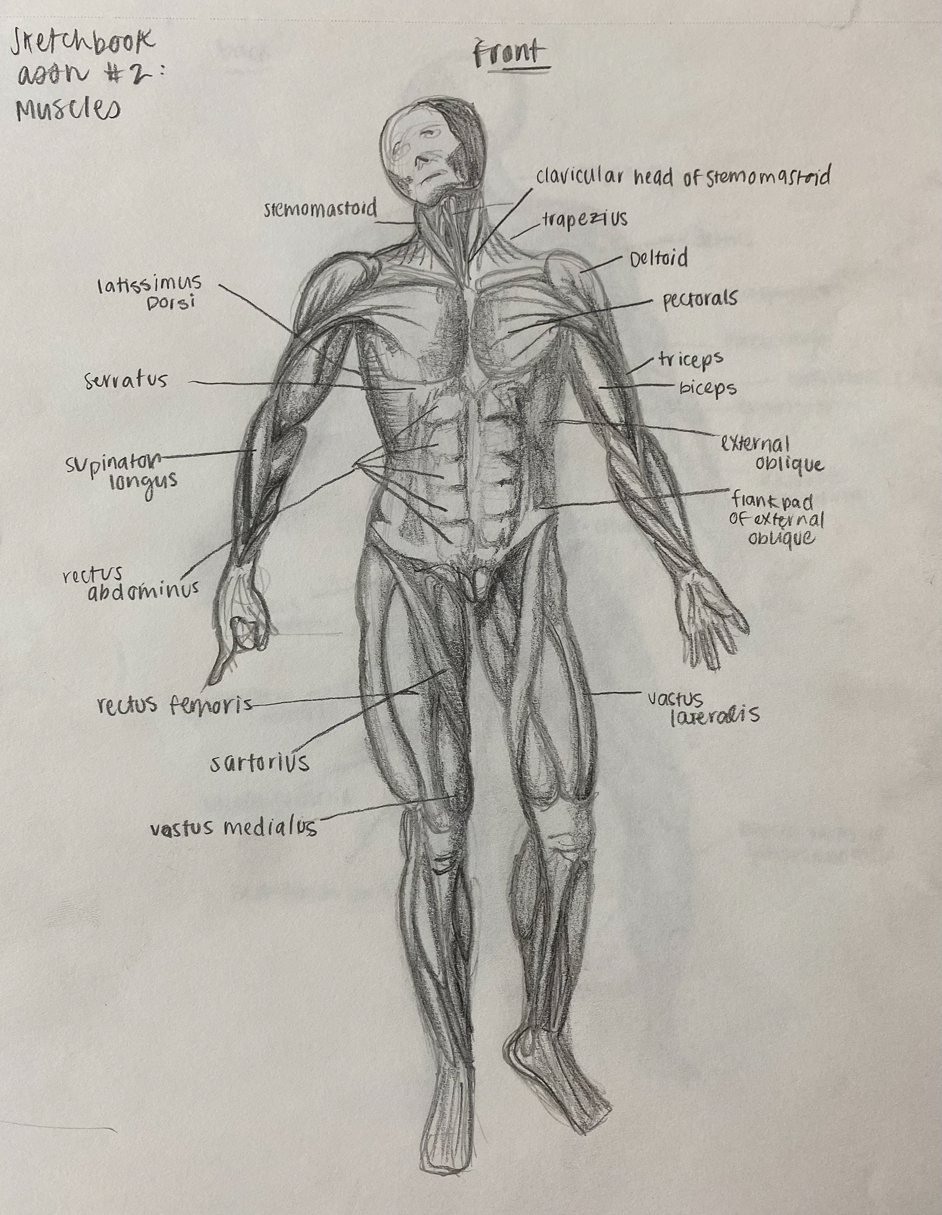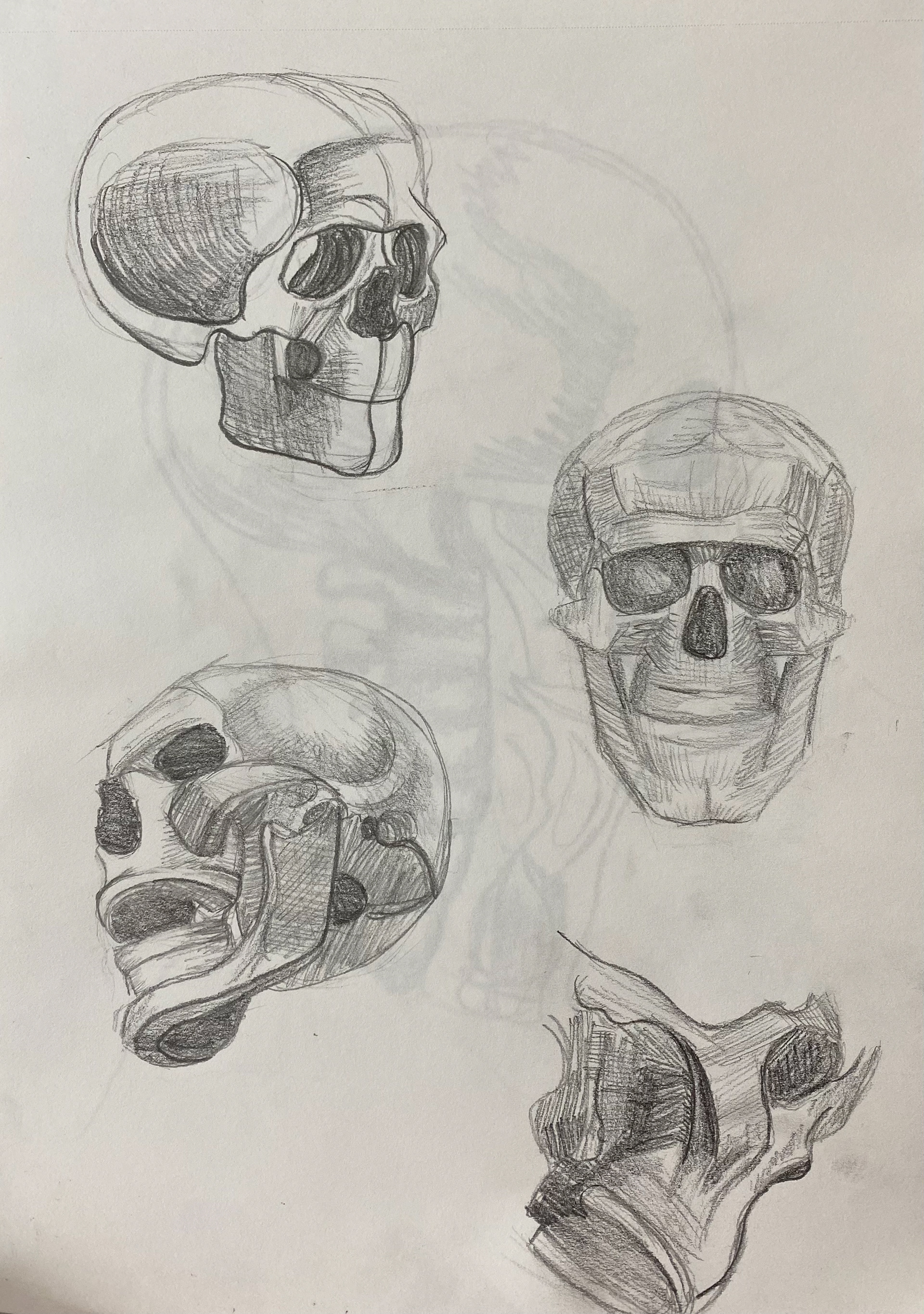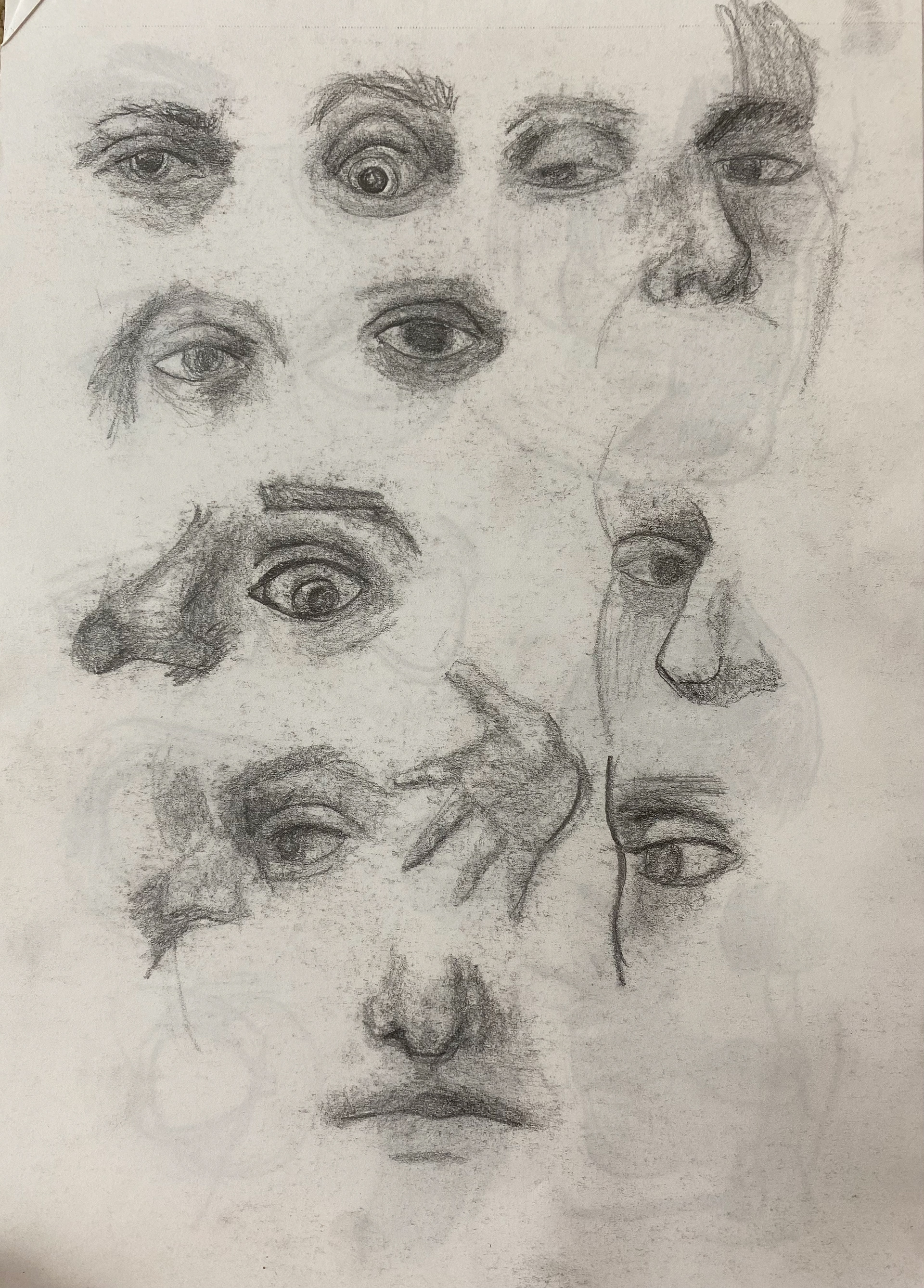 18x24 in drawing paper and charcoal. This is a study of the human head and face and its proportions. The top of the page is a proportional line drawing of the face, whereas the bottom is the realistic drawing of the face.